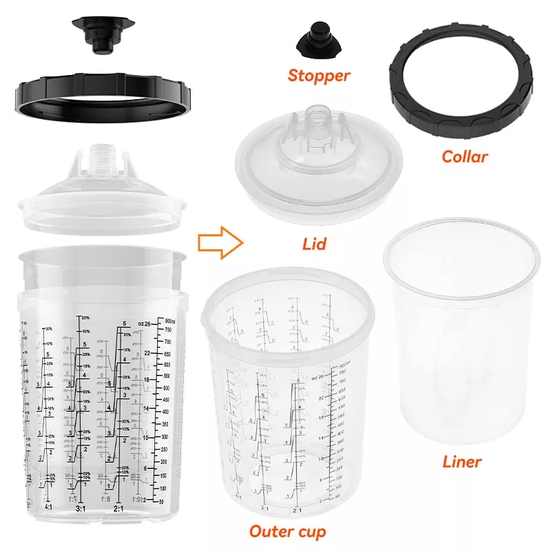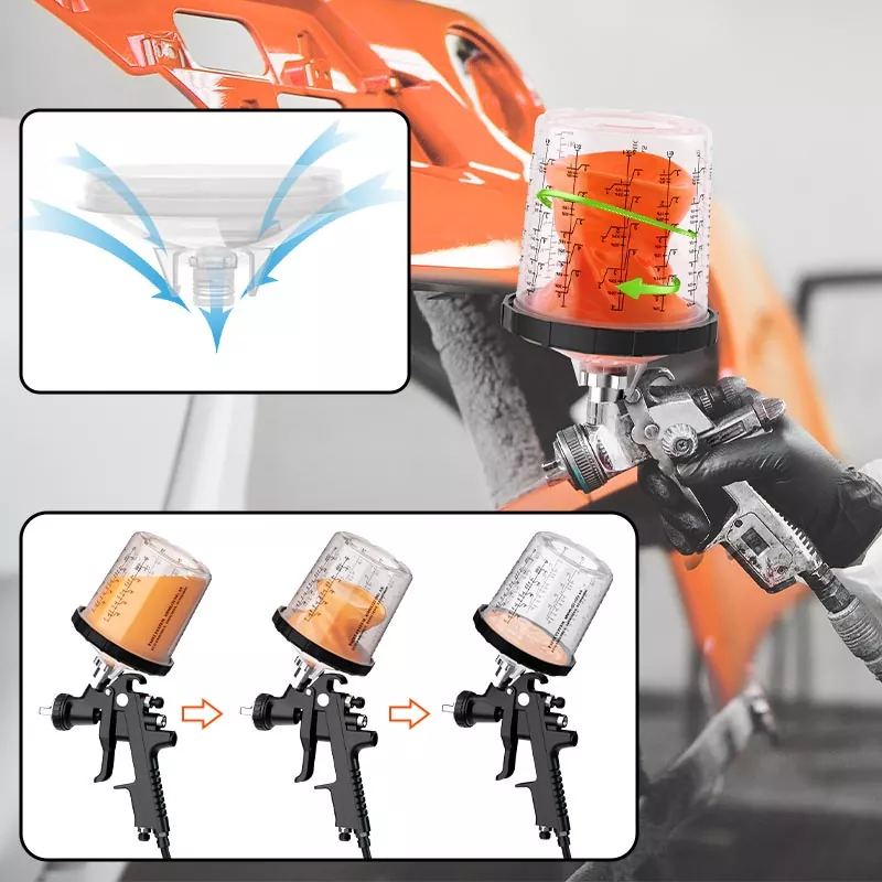 O sistema de copo de tinta descartável 800ML 1.0 contém 28,5 fl oz (850 ml) de tinta, é ideal para reparos de 4 painéis ou menos de material, incluindo lotes grandes de revestimento transparente. A tinta pode ser misturada diretamente no copo de pulverização e apenas uma limpeza mínima é necessária após cada uso. Se você deseja vender copos de pistola descartáveis no atacado, entre em contato conosco para obter amostras grátis para teste.