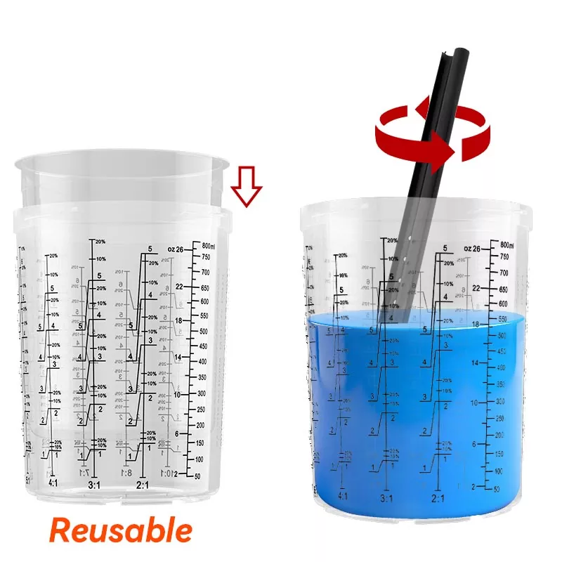 Copo externo reutilizável com escala de proporção de mistura. Insira o liner descartável no copo externo e misture a tinta diretamente no liner. Reduza o custo do material não usando um copo de mistura tradicional.