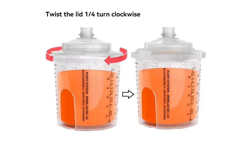 Ao desbloquear o sistema, antes de tudo, pressione a pistola no fundo e gire no sentido anti -horário até que o adaptador esteja livre; Segundo, continue girando até que a tampa esteja completamente livre das fechaduras no copo externo e depois desconecte a pistola de pulverização.