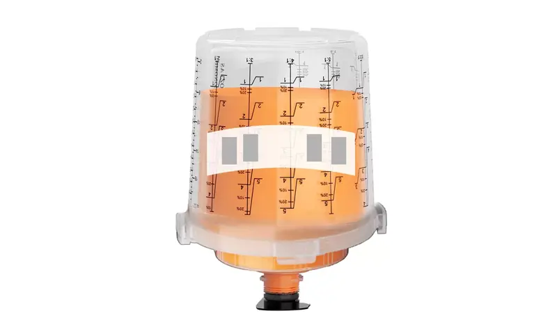 O copo externo pode ser personalizado com um logotipo e uma escala, o que permite que o copo de pulverização descartável seja marcado exclusivamente.