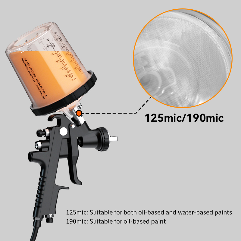 • Filtros integrados integrados para acabamento de pintura superior: A tampa descartável do copo de spray possui filtros integrados de 190μ (tinta à base de óleo) e 125μ (tinta à base de água), filtrando efetivamente as impurezas durante a pulverização e aumentando o brilho da tinta em 20%.